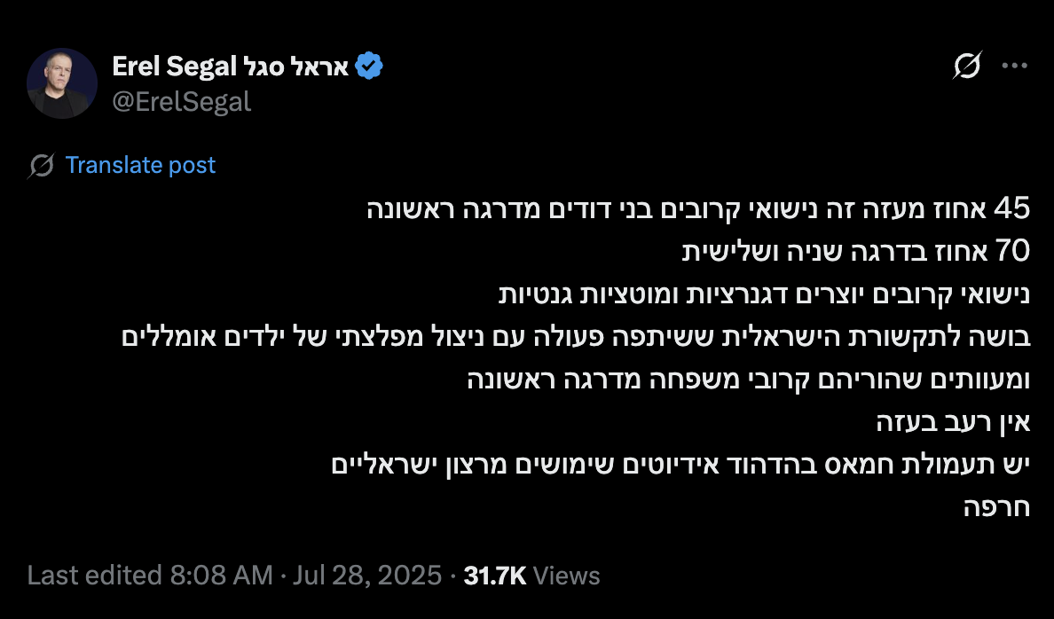 45 percent of Gaza involves first-cousin marriages. 70 percent in second and third degrees. Cousin marriages create genetic degeneration and mutations. Shame on the Israeli media that collaborated with the monstrous exploitation of miserable and deformed children whose parents are first-degree relatives. There is no hunger in Gaza. There is Hamas propaganda echoed by willing Israeli idiots. Disgrace.