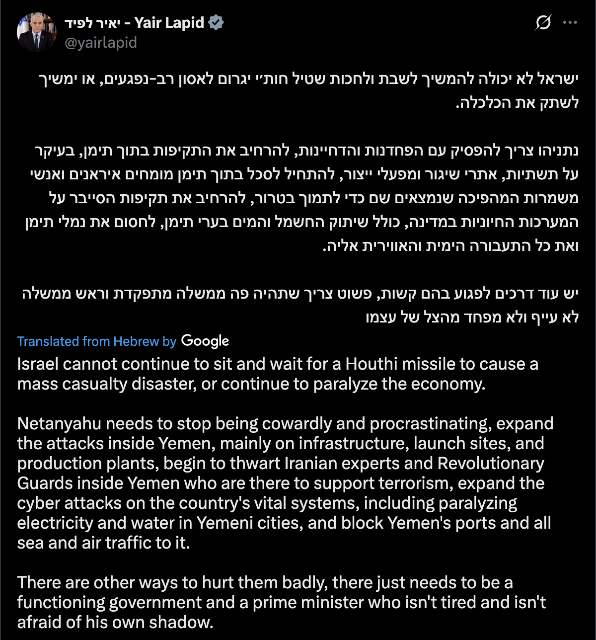Netanyahu needs to stop being cowardly and procrastinating, expand the attacks inside Yemen, mainly on infrastructure, launch sites, and production plants, begin to assassinate Iranian experts and Revolutionary Guards inside Yemen who are there to support terrorism, expand the cyber attacks on the country's vital systems, including paralyzing electricity and water in Yemeni cities, and block Yemen's ports and all sea and air traffic to it.