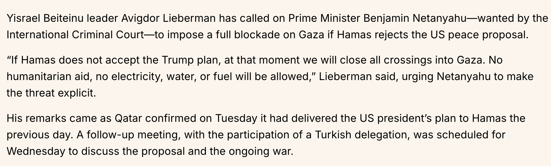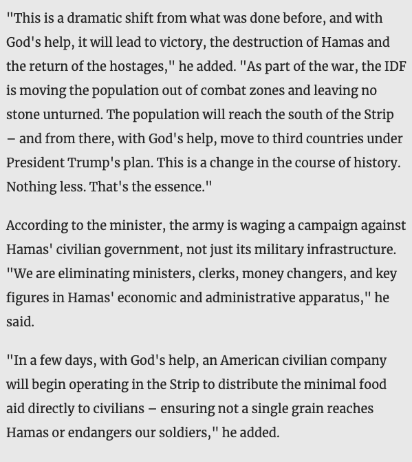 If Hamas does not accept the Trump plan, at that moment we will close all crossings into Gaza. No humanitarian aid, no electricity, water, or fuel will be allowed.
