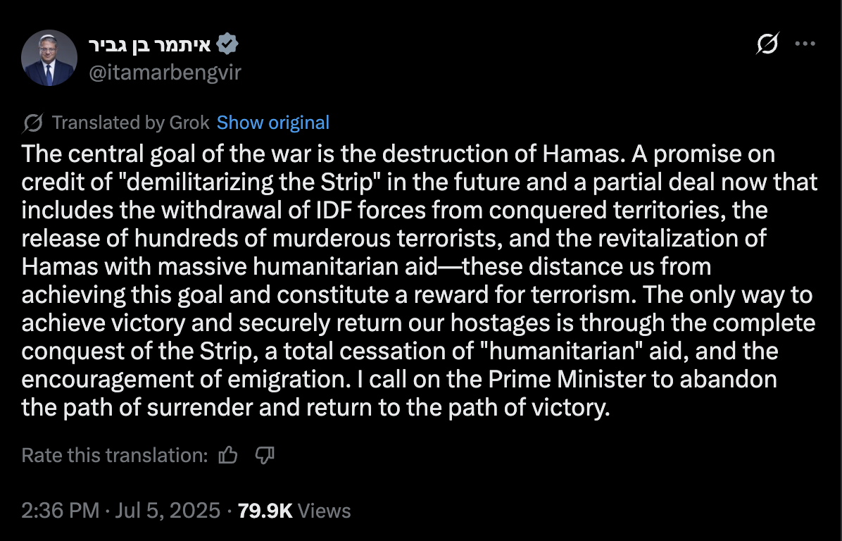 "The only way to achieve victory . . . is through the complete conquest of the Strip, a total cessation of "humanitarian" aid, and the encouragement of emigration."