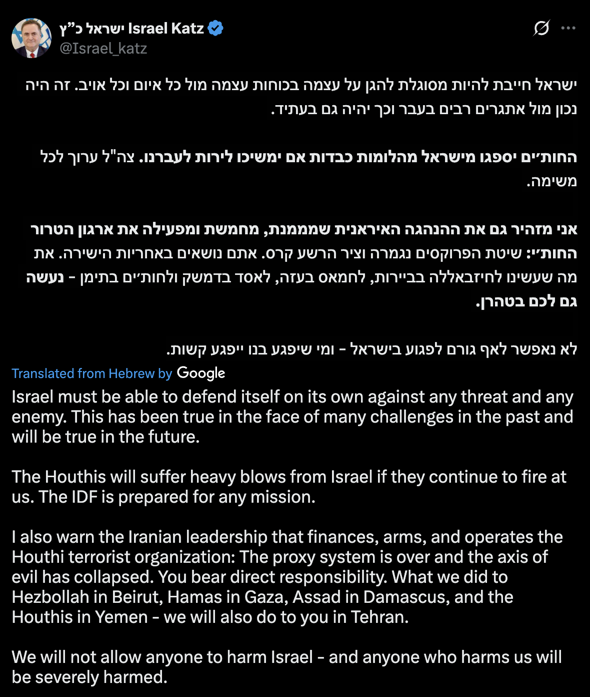 What we did to Hezbollah in Beirut, Hamas in Gaza, Assad in Damascus, and the Houthis in Yemen - we will also do to you in Tehran.