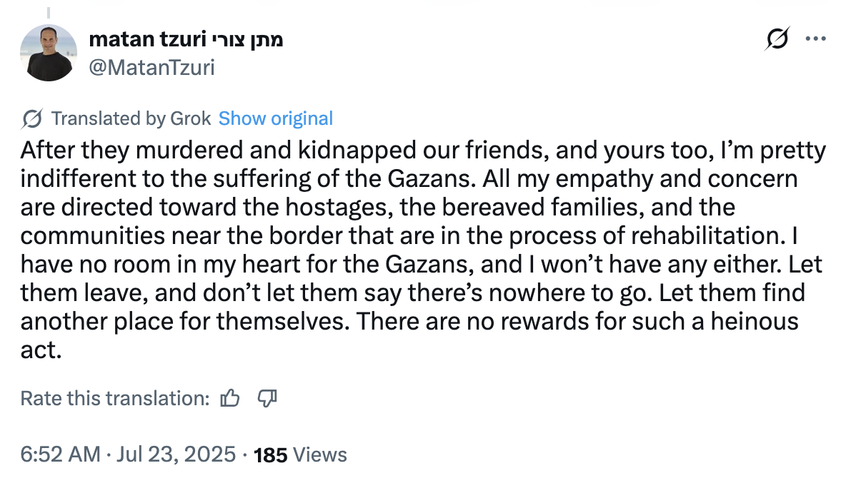 What we are doing in Gaza is a war of extermination: the indiscriminate, unrestrained, brutal, and criminal killing of civilians. We are doing this not because of an accidental loss of control in a particular sector, not because of a disproportionate outburst of fighters in some unit — but as a result of a policy dictated by the government, knowingly, intentionally, viciously, maliciously, recklessly. Yes, we are committing war crimes.