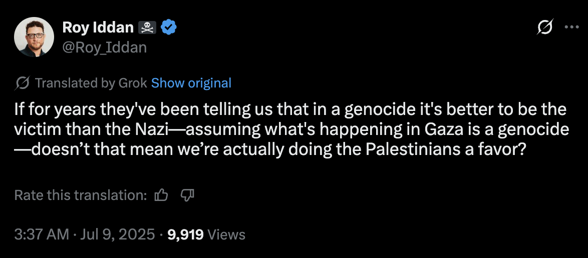 If for years they've been telling us that in a genocide it's better to be the victim than the Nazi—assuming what's happening in Gaza is a genocide—doesn’t that mean we’re actually doing the Palestinians a favor?