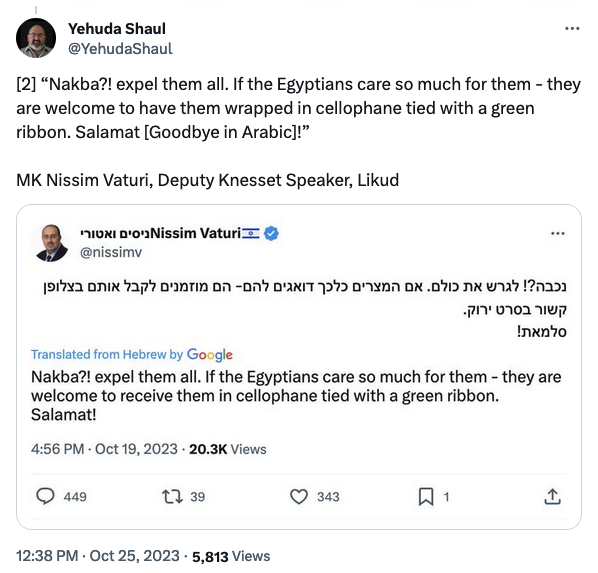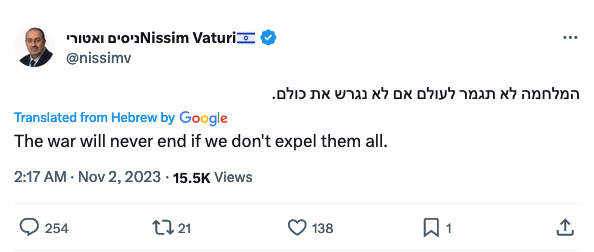 We are now rolling out the Gaza Nakba ... There is no way to wage a war – as the IDF seeks to do in Gaza – with masses between the tanks and the soldiers ... Gaza Nakba 2023. That’s how it’ll end.