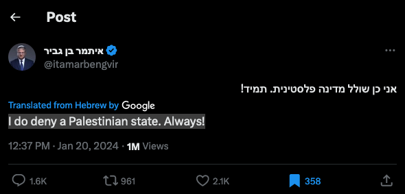 There will never be a Palestinian state here. We will never allow another state to be established between the Jordan River and the sea. We will never go back to Oslo.