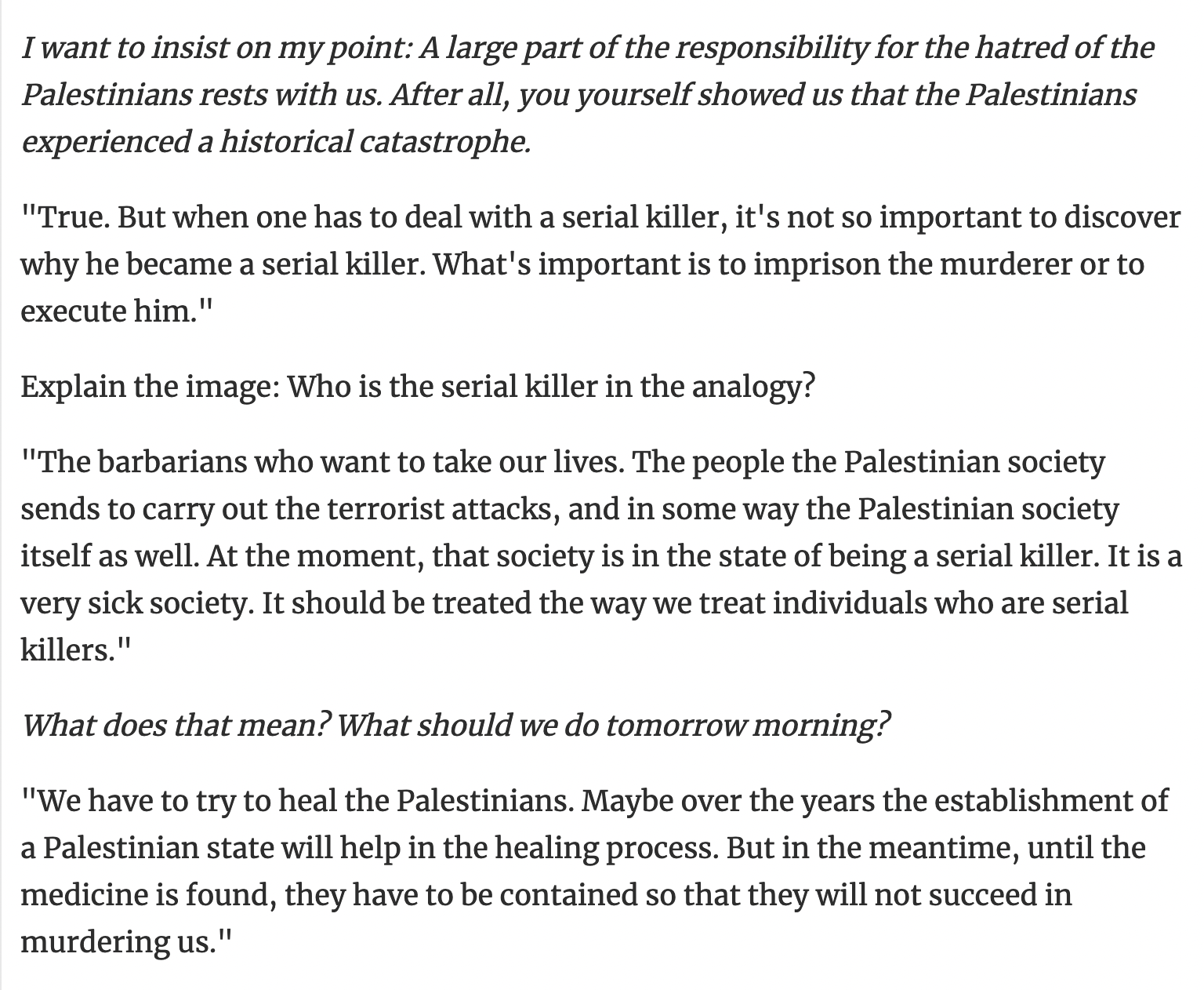 The barbarians who want to take our lives [are like serial killers]. The people the Palestinian society sends to carry out the terrorist attacks, and in some way the Palestinian society itself as well. At the moment, that society is in the state of being a serial killer. It is a very sick society. It should be treated the way we treat individuals who are serial killers.