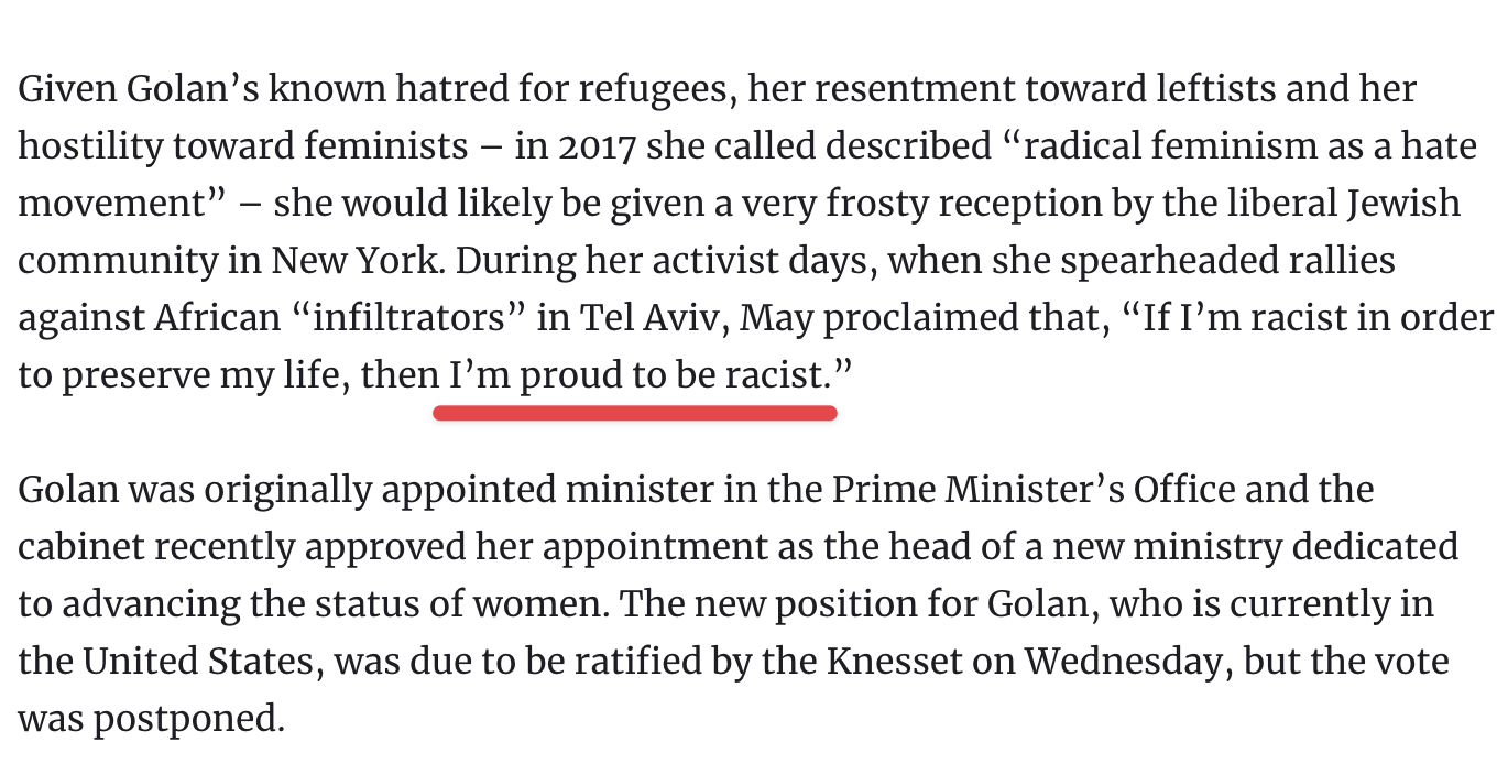 [I]f an Arab murders an Arab in an Arab village, they automatically blame the police for not patrolling enough, but they will not blame themselves and say that Arabs murder Arabs because it seems quite natural there… In the Arab world – and the Israeli Arabs are part of it – you find a lack of self-criticism. It’s always the stranger who’s to blame. The Briton, the American, the Russian, the Jew, the Israeli – someone else is to blame for your troubles. They breed much more crime, in comparison to Jewish society. If you were to tell me that they are poorer and therefore they have more property crimes and theft, I would say: That’s right, poor societies breed material crime. But we’re talking about murder in far larger numbers. It’s not a matter of money. It’s the society’s nature.