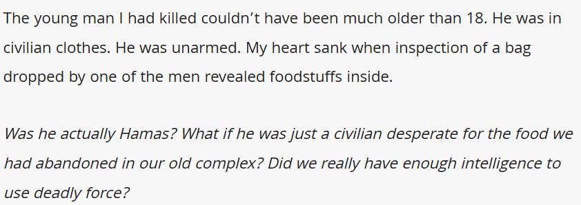 The young man I had killed couldn’t have been much older than 18. He was in civilian clothes. He was unarmed. My heart sank when inspection of a bag dropped by one of the men revealed foodstuffs inside.