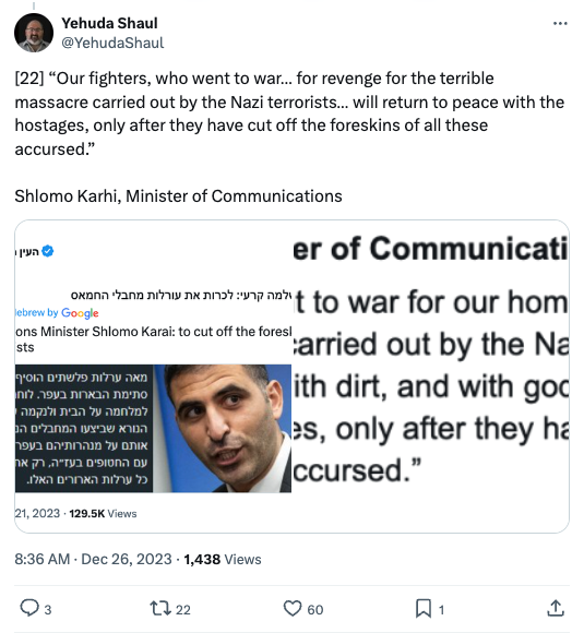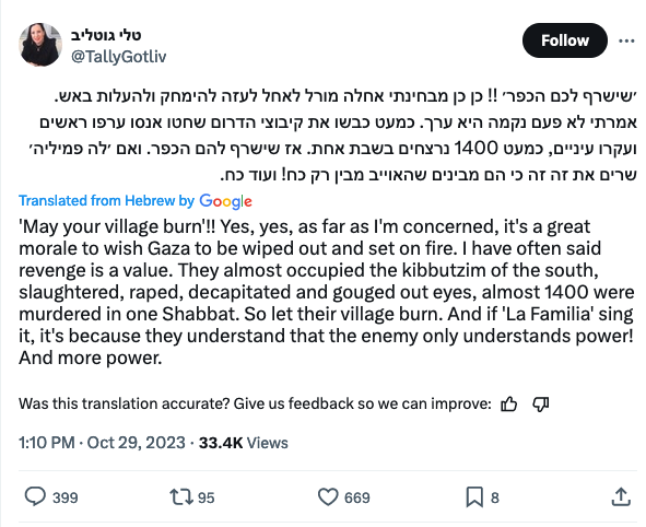 I would like to say that we, in Israel, at least the population, are not interested in all this rational Palestinian talk. For us, there is one purpose: to destroy Gaza, to destroy this absolute evil. To destroy this. There is no chance that after the holocaust, Jewish people will live similar experiences as they [experienced] 80 years ago.
