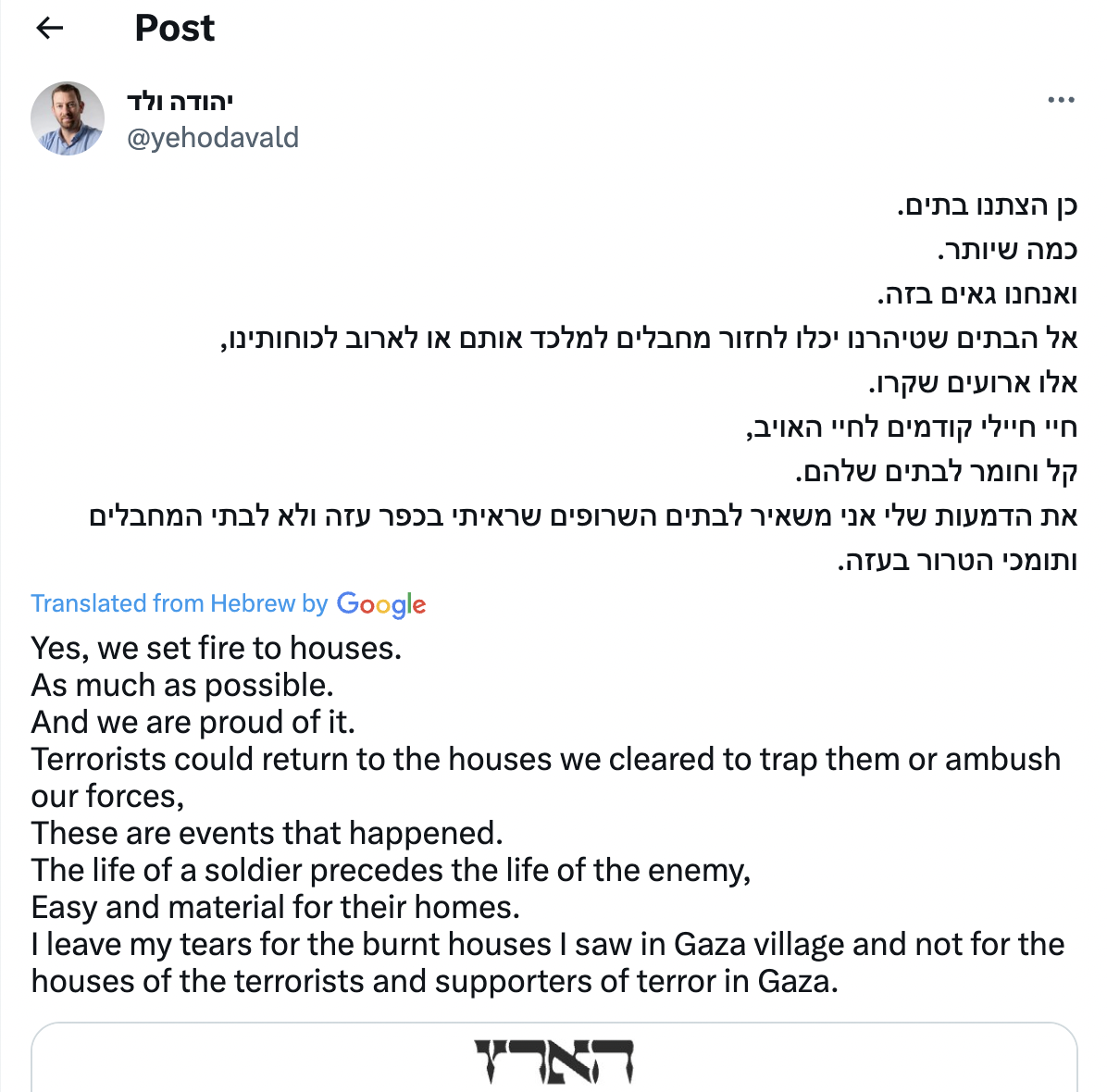 Yes, we set fire to houses [in Gaza]. As much as possible. And we are proud of it.