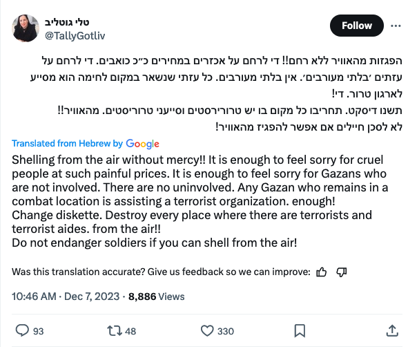 Hamas is not the enemy, but Gaza is the enemy. [...] It is not important who you warn, or who evacuates a neighborhood. This is what is called flattening the area, leveling the ground. You ask me what I would do? The answer is simply leveling the ground, and to kill the largest number possible. Because the woman is an enemy, the baby is an enemy, and the first grader is an enemy. The Hamas militant is an enemy and the pregnant woman is an enemy. We see it with our own eyes.