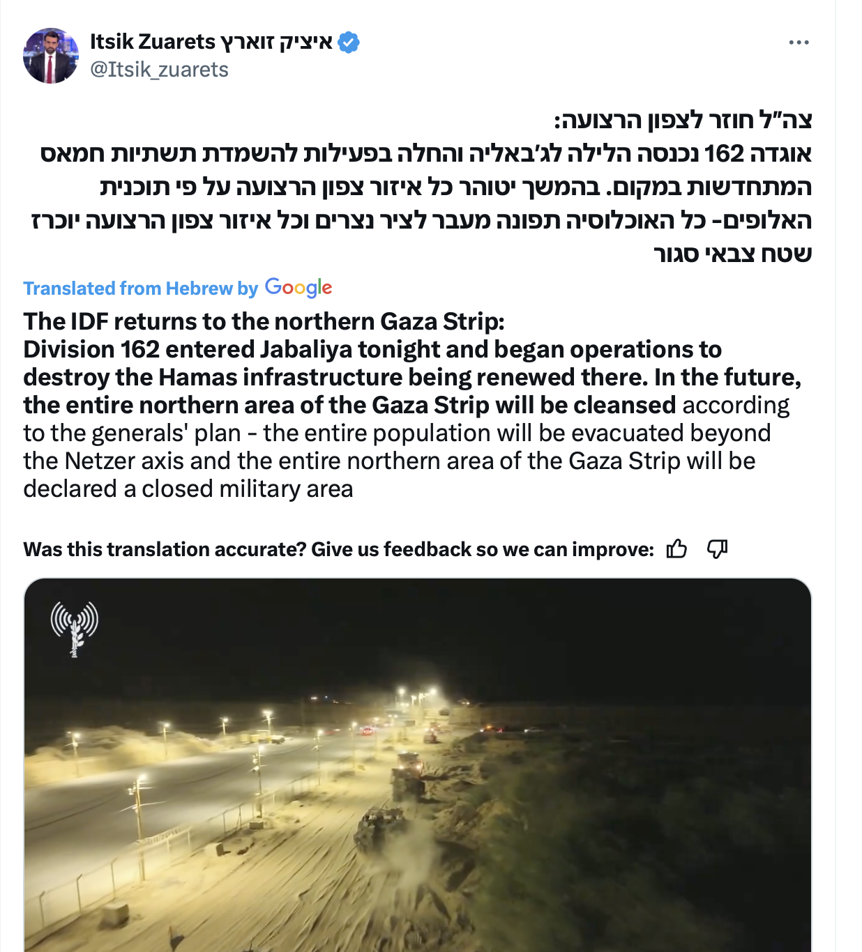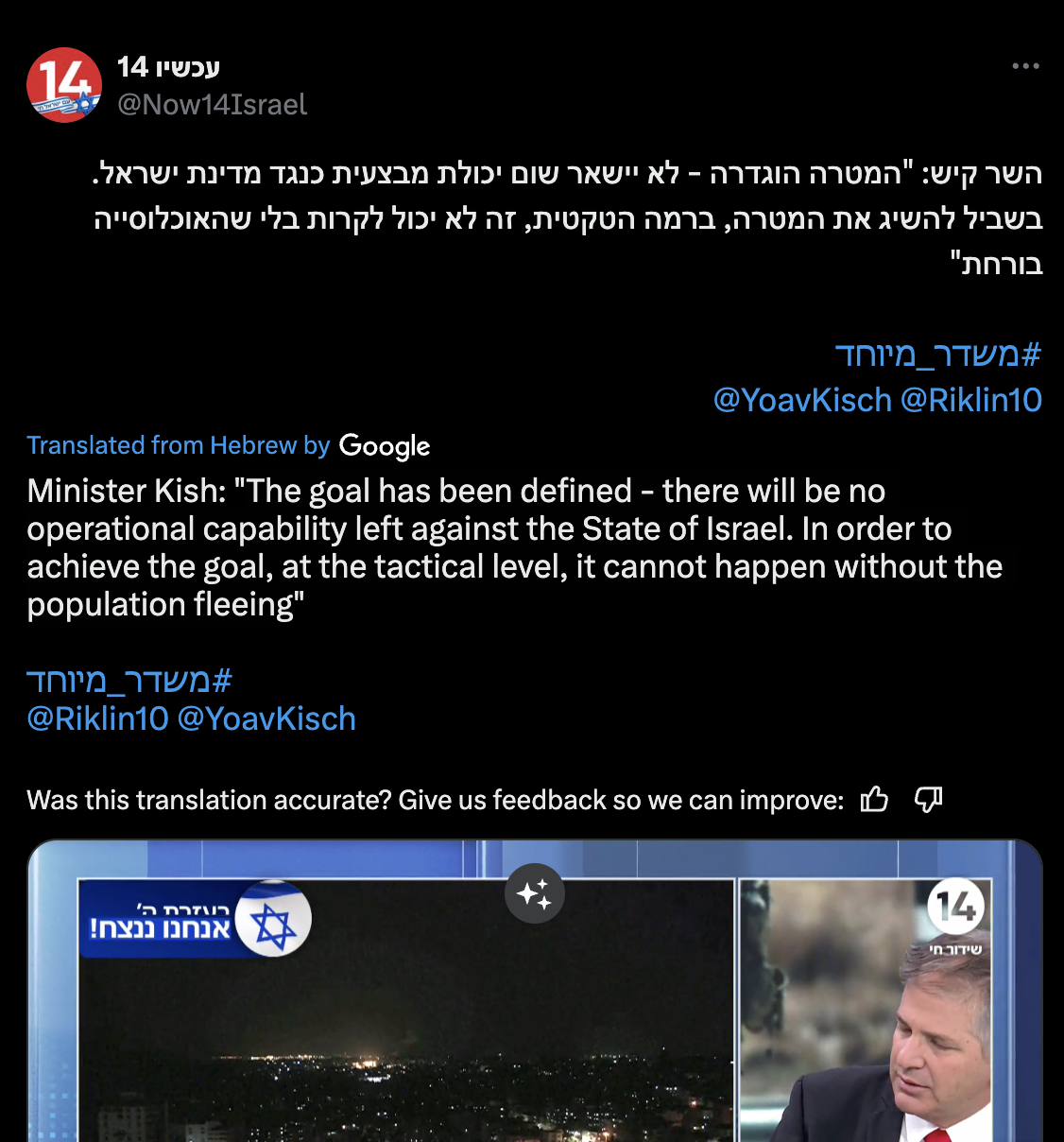 This [attack] is not enough, there should be more, there should be no limits to the response, I said it a million times, until we see hundreds of thousands fleeing Gaza, we, the IDF has not achieved its mission, this is a phase that should happen, I am saying this cause these are instructions that were said to the IDF [...] I also do not want [the IDF] to get inside [Gaza] before crushing everything, I’d rather the falling of fifty buildings than one more casualty to our forces.