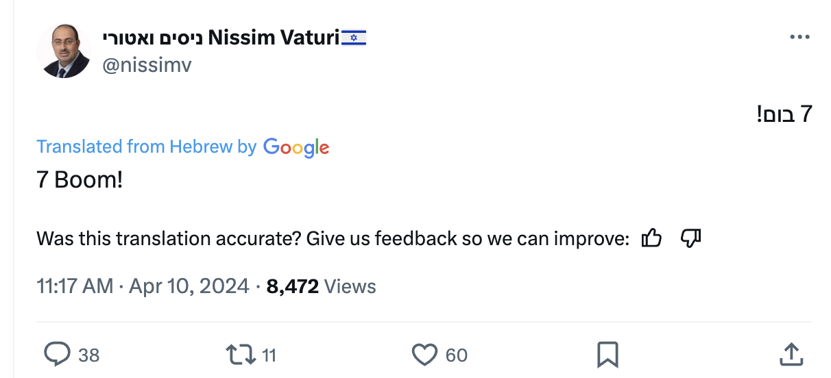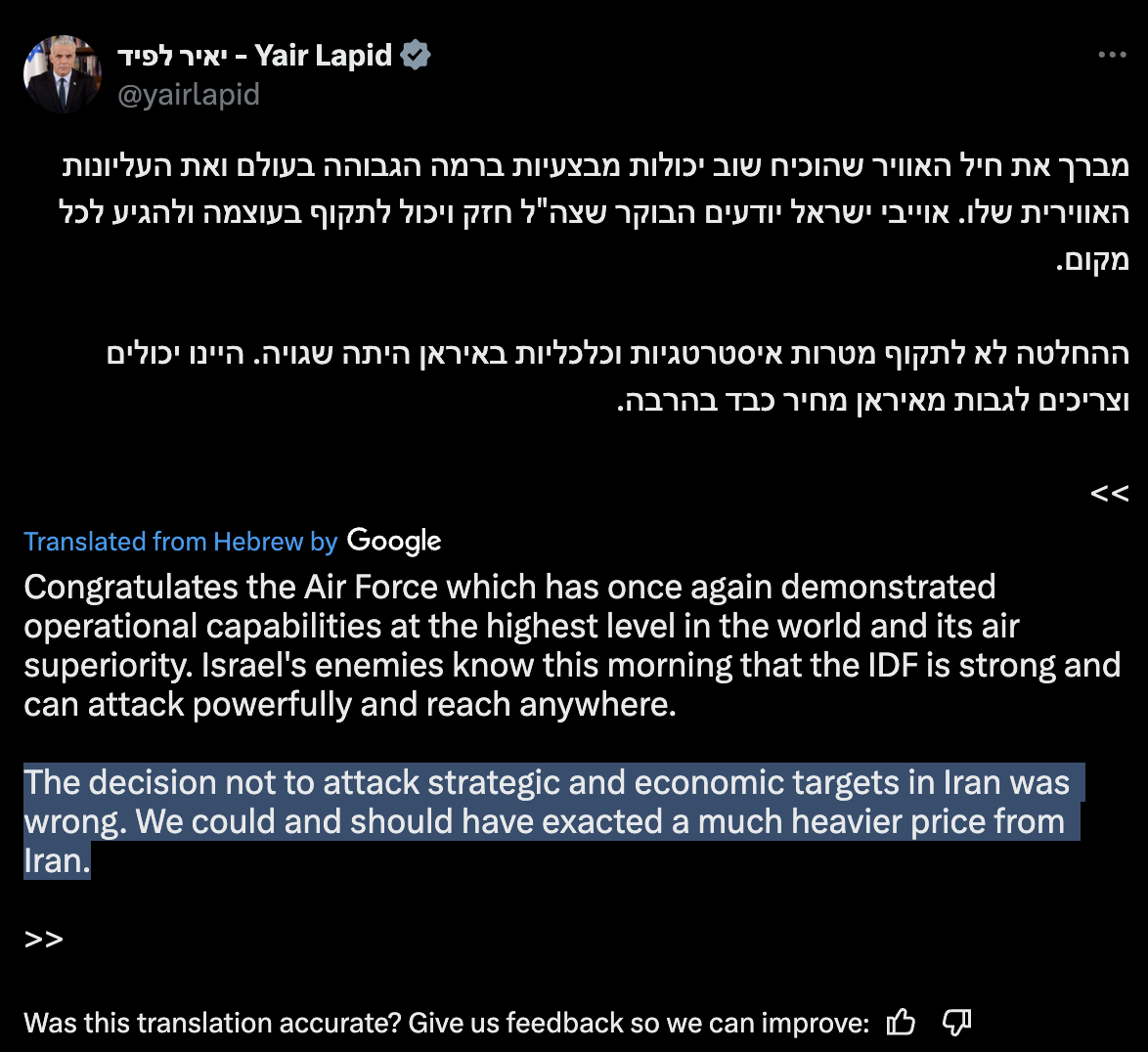 Throughout the past 24 hours, we have been conducting aerial strikes- destructive aerial operations that include thousands of armaments. To put that in perspective, the pace of the strikes is five times that of the strikes on Hezbollah in the Second Lebanon War. I repeat, five times what it was against Hezbollah in the Second Lebanon War.