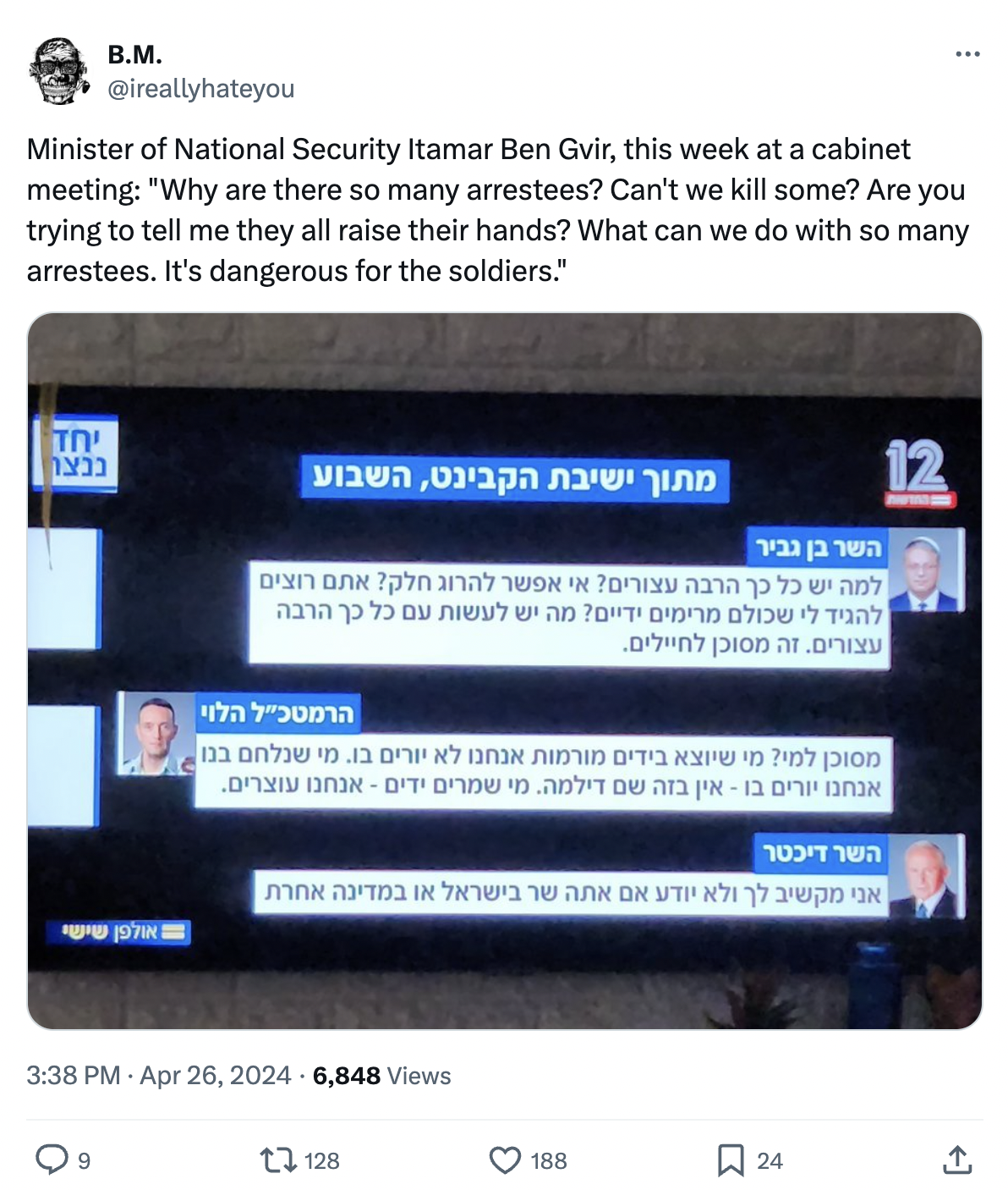 On the first night, we should have taken down 50,000 Gazans, as a blood revenge. Cabinet discussions later, humanitarian later, prisoners and missing persons later. The first check - blood revenge. This is what Ben Gurion knew.